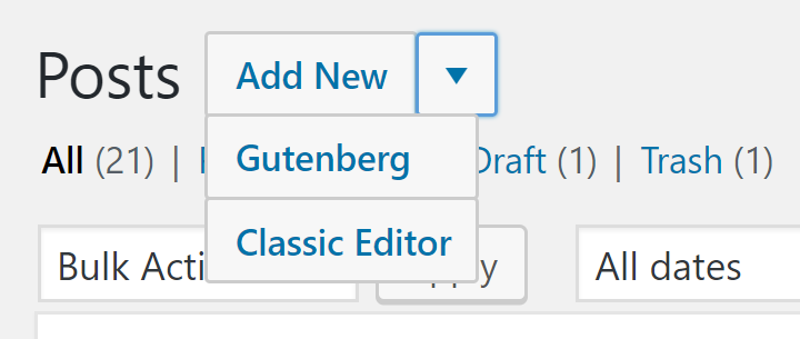 - creating a new post with the Classic Editor. Do not click on add post in the wp-admin dashboard, as that will bring up the Gutenberg editor. Click All posts instead, and select Classic Editor from the Add New dropdown box at the top left of the screen (as shown on the left).