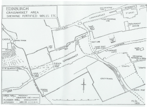 As shown in the diagram above, the wall ran eastwards from the Castle Rock above the Grassmarket, crossed West Bow and then ran eastwards again halfway between High St and Cowgate, roughly level with the south gable of Old Parliament Hall. It cut gardens in two, resulting in people making openings in the wall to allow normal movement.