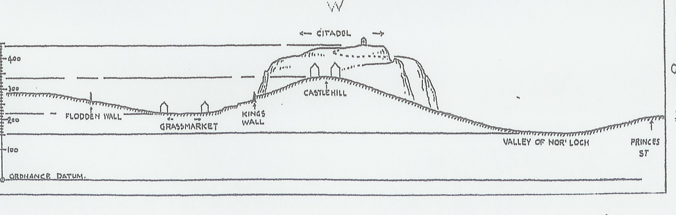As shown in the diagram above, the wall ran eastwards from the Castle Rock above the Grassmarket, crossed West Bow and then ran eastwards again halfway between High St and Cowgate, roughly level with the south gable of Old Parliament Hall. It cut gardens in two, resulting in people making openings in the wall to allow normal movement.