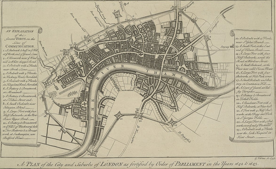 The Parliamentarians were based in London and the Royalists in Oxford. Both sides constructed defensive earth ramparts: the one in London, called the Lines of Communication, was 11 miles in length and took 5,000 men to complete it; while Oxford’s was a more modest 3 miles.