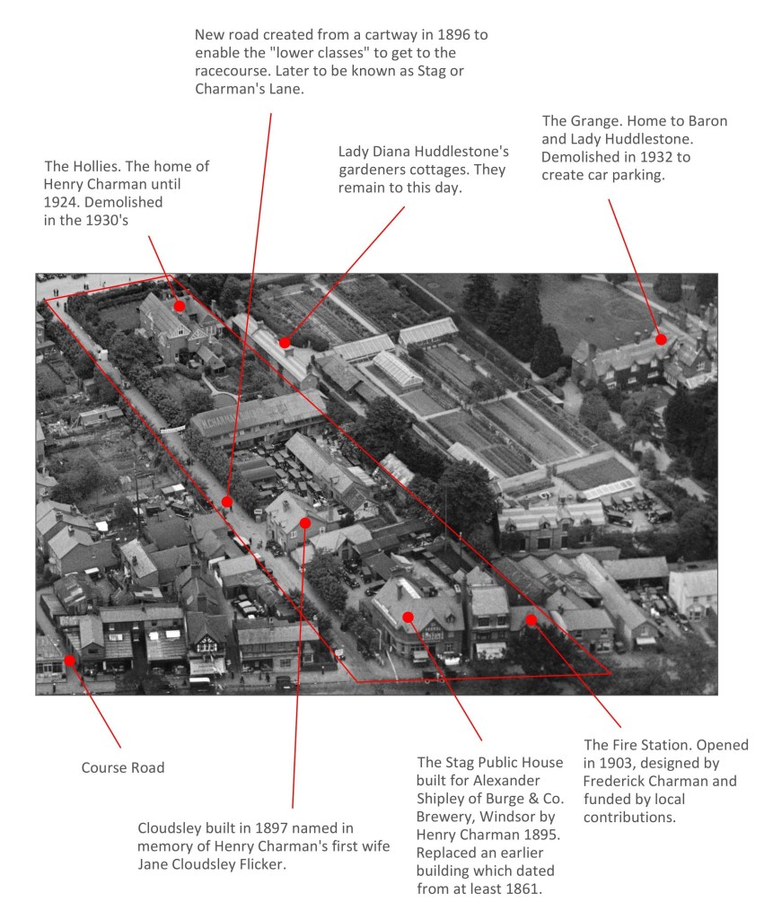 As shown in the picture below which was taken in 1923, it covers the Stag public house and the old Fire Station (now the Hyperion Tile shop) on the High Street, along with the various buildings behind them up to the Racecourse. The grand building on the right was The Grange with its grounds and a row of gardeners’ cottages.