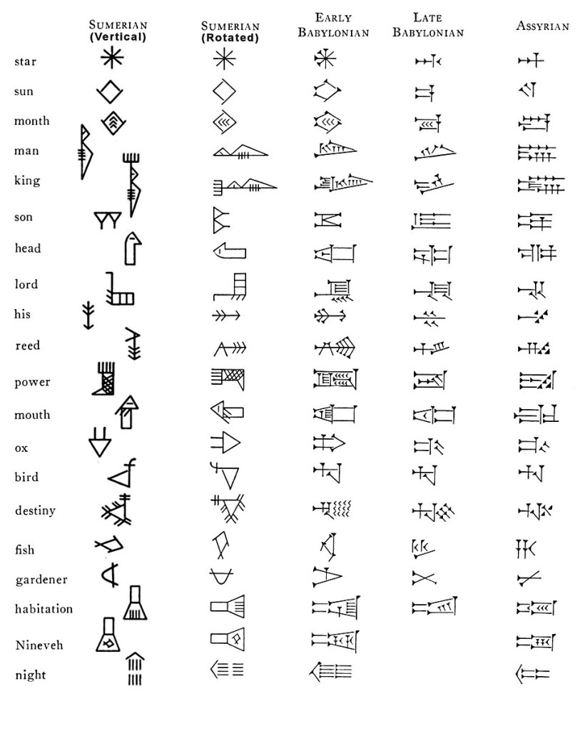 Continuing with the trading theme, the earliest cuneiform signs were pictograms (pictures which represented commodities) that were drawn on clay by the Sumerians circa. 3400 BCE. However, drawing was too slow and a reed stylus was used to make impressions on clay tablets, representing numbers and some pictograms. Pictograms could be joined together: plough plus wood = plough; but plough plus man equals ploughman. They quickly started to become more abstract. A logogram looked less like an object, although its relationship with the object was clear. Phonetic signs and determinate marks also appeared, the latterbeing used to clarify meaning, e.g. religion, place et cetera.